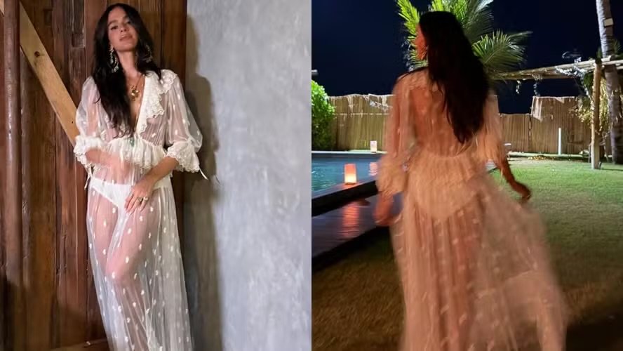 O longo branco transparente rendado eleito pela atriz, com decote em V e mangas bufantes, que dão um ar romântico, pertence à coleção primavera-verão 2026 da grife francesa e está avaliado em R$ 53.604.