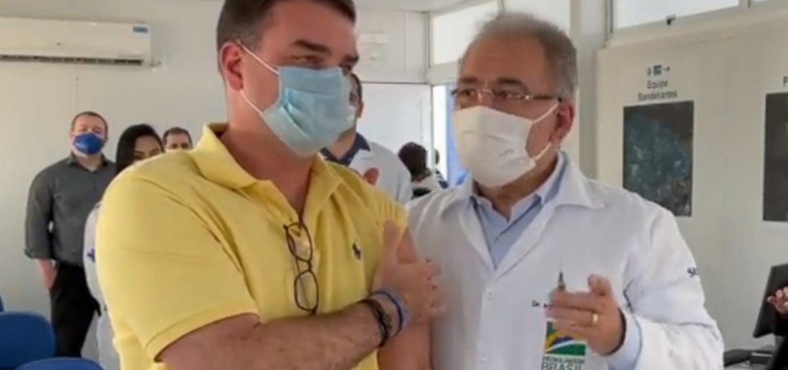 O senador Flávio Bolsonaro postou um vídeo em sua conta no Instagram em que aparece dando o braço para o ministro da Saúde, Marcelo Queiroga, aplicar a primeira dose da vacina contra o coronavírus. O senador tem 40 anos e foi imunizado no Rio nesta quinta (22), na repescagem para quem tem mais de 35 anos. Homens de sua idade foram vacinados no último dia 9 de julho.