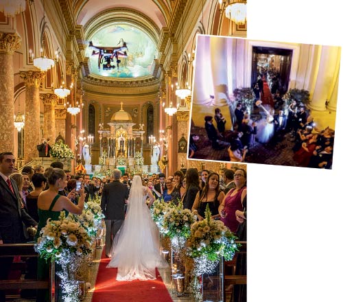 Ao entrar na Basílica Santa Terezinha do Menino Jesus, na Tijuca, no último sábado (26), a advogada Priscilla Dellano não foi a única a chamar a atenção dos convidados de seu casamento. Enquanto a noiva atravessava a igreja rumo ao altar, uma espécie de óvni com luzes de neon pairava sobre ela, atraindo não apenas os olhares como também as lentes de smartphones dos convivas. O aparelho era um drone monitorado por controle remoto e equipado com uma câmera das mais modernas, chamada 4K, cuja resolução é quase cinco vezes maior do que a da HD, aquela usada nas novelas. Dotada de hélices de plástico e quatro pequenos motores, a engenhoca é utilizada para captar cenas da cerimônia e da festa em ângulos inusitados. “É uma atração à parte. O casamento fica ainda mais marcante, ninguém vai se esquecer do que viu”, diz Priscilla. O serviço, que custa a partir de 10?000 reais, pode ser utilizado ainda para transmitir o evento ao vivo pela internet para os amigos e parentes distantes que não puderam comparecer.