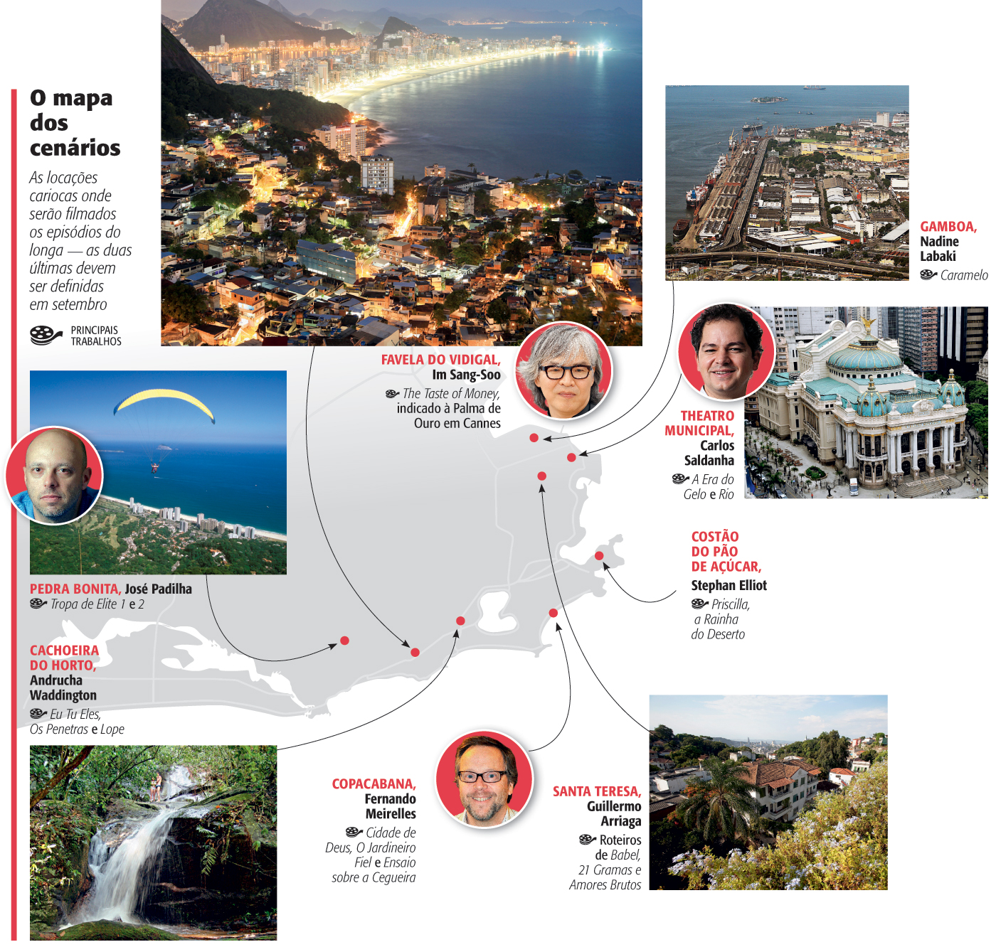 Difícil é escolher, entre tantos cartões-postais inspiradores, que lugares da capital mereceriam servir de pano de fundo para os romances que vão ganhar as telas do mundo inteiro no terceiro capítulo do projeto, que já lançou Nova York, Eu Te Amo e Paris, Eu Te Amo. A decisão ficou a cargo dos próprios diretores, munidos de total liberdade criativa no desenvolvimento de seus roteiros. Além dos brasileiros Saldanha, Fernando Meirelles, José Padilha e Andrucha Waddington, há representantes de todas as partes do globo. Nadine Labaki é franco-libanesa; Guillermo Arriaga, mexicano; Im Sang-Soo, coreano. Mais dois nomes, um americano e um europeu, ainda devem se juntar à turma. “Buscamos olhares bem distintos, evitando visões estereotipadas. Todos eles conhecem muito bem a cidade, já estiveram aqui várias vezes”, explica Pedro Buarque de Hollanda, da Conspiração Filmes, que divide a coprodução com a BossaNovaFilms e a Empyrean Pictures.