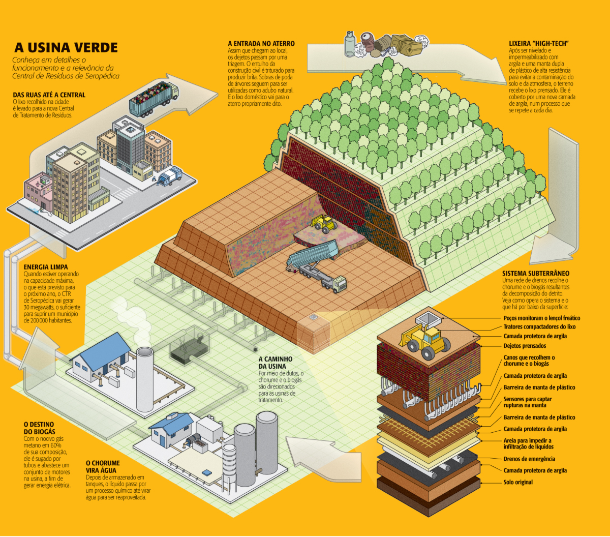 Toneladas de lixo despejadas à margem da Baía de Guanabara e entregues à natureza ? num jogo em que ela, a natureza, sai sempre perdendo. Em funcionamento há quase 35 anos, o Aterro de Gramacho, na Baixada Fluminense, é o retrato do desleixo ambiental, com rios de chorume vazando para o lençol freático, gases nocivos contaminando a atmosfera e urubus em profusão pondo em risco os voos do Aeroporto do Galeão. Para completar o quadro, bem estampado nos documentários Estamira e Lixo Extraordinário, milhares de catadores atuam no local, formando um degradante formigueiro humano. Condenado há muito tempo pelos especialistas, o lixão, como é conhecido, está com os dias contados e deve encerrar suas atividades no próximo ano. Ele será paulatinamente substituído por um sistema moderno, inaugurado há duas semanas em Seropédica, na região metropolitana do Rio. A nova Central de Tratamento de Resíduos (CTR) é, digamos assim, uma lixeira “high-tech”. Ao custo de 400 milhões de reais e concentrado numa extensão de 2 quilômetros quadrados, equivalente à área do Leblon, o novo aterro sanitário tem dispositivos para impedir qualquer tipo de contaminação e é capaz de transformar o detrito em energia (veja o quadro). “É a solução para um crime ambiental cometido há três décadas”, afirma Carlos Roberto Osório, secretário municipal de Conservação.