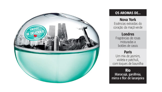 Num frasco esférico com fotos da orla e do Cristo encontra-se o cheiro do Rio. Essa é a proposta da marca americana DKNY, que lança também fragrâncias que tentam captar a essência de outras capitais mundo afora. Paris, por exemplo, tem odor de jasmim. Big Apple que é, Nova York naturalmente cheira a maçã. O tropical maracujá dá a base para o perfume carioca. Mas não sue correndo atrás agora: por causa da recente greve dos funcionários da Anvisa e da Receita, o produto esteve preso na alfândega e só chegará às lojas em outubro.