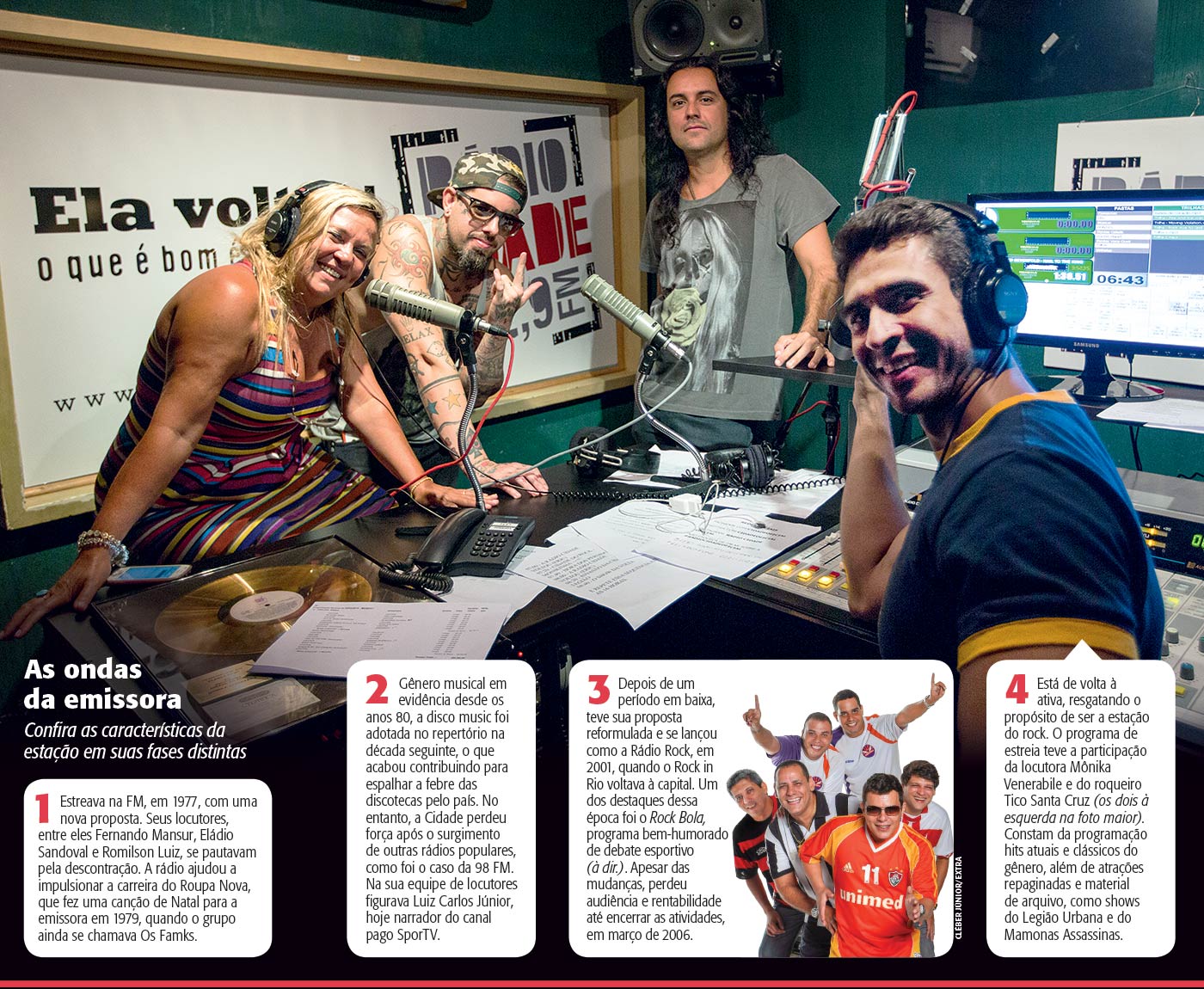 A onda nostálgica tem razão de ser e faz justiça a uma estação que balançou as estruturas da radiodifusão no país, promovendo mudanças que vieram para ficar. Até a chegada da Cidade, as FMs na prática se limitavam a emitir a chamada música de elevador, com blocos de canções entremeados com uma narração monocórdia. Na direção oposta, a novata no dial investia em um repertório popular, alternando hits americanos com cantores brasileiros consagrados: Milton, Caetano, Bethânia, Gil, Chico. Como principal inovação, porém, a Cidade introduziu a descontração e o bom humor no estúdio. A equipe inesquecível de locutores, formada por Jaguar (não confundir com o cartunista), Fernando Mansur, Eládio Sandoval, Romilson Luiz e Ivan Romero, instituiu um novo jeito de se relacionar com o ouvinte. “Tínhamos liberdade para improvisar, brincar, fazer piadas. Cada um foi criando a própria personalidade no ar, e esse estilo se alastrou pelas emissoras do país”, recorda Mansur, que relata a trajetória da rádio no livro No Ar, o Sucesso da Cidade. Nessa linha cômica, foram marcantes as paródias feitas na emissora que viraram discos de sucesso. Um carioca de 40 anos há de se lembrar do hit Eu Hoje Vou Me Dar Bem, também conhecido pelo refrão “o nome dela é Waldemar”, impagável versão de Você Não Soube Me Amar, da Blitz, na voz de Sandoval e Romilson Luiz. Outro desdobramento do sucesso foram os shows promovidos pela rádio, que lotavam espaços como o Arpoador e o Maracanãzinho.