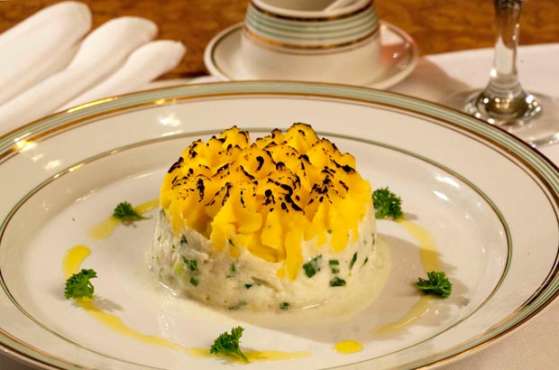 – Cobrir o fundo de urna vasilha refratária com um pouco do purê de baroa e colocar creme de bacalhau por cima. Alisar bem a superfície.