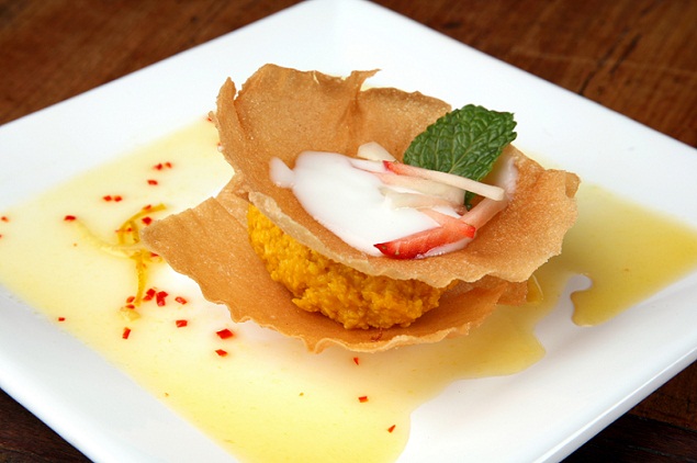 8 – Sawasdee Bistrô. Menu almoço. Entrada: satay ped (espeto de pato ao molho de abacaxi) ou salmon dream (bolinho de salmão à milanesa, crocantes por fora e cremosos por dentro. servidos com pimenta e mel). Prato principal: nua pad nanman hoi (lâminas de filé mignon ao perfume de anis estrelado com legumes verdes ao estilo thai) ou nam katte pla (linguado empanado com crosta de especiarias ao molho de coco e cúrcuma, repolho roxo salteado e farofinha de amendoim e manjericão). Sobremesa: yam leechee (salada de papaya com lichia, com fios de capim limão) ou sang khaia fak tong (abóbora recheada com manjar de coco, coberta com calda de caramelo e flocos de coco ralado).