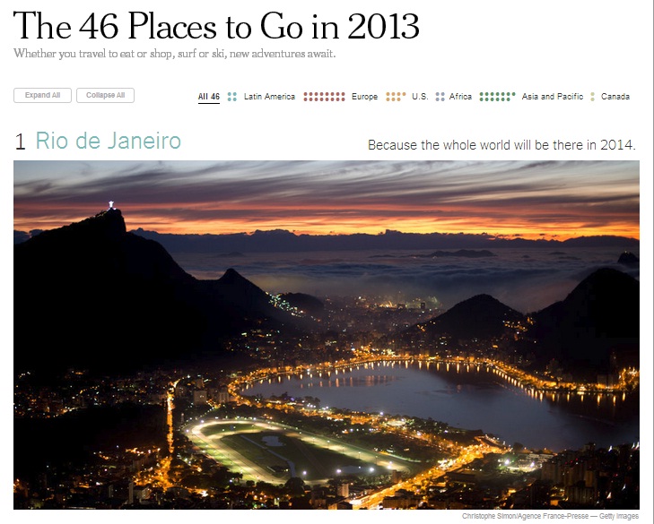 O Rio de Janeiro ficou em primeiro lugar em uma lista desenvolvida pela editoria de turismo do jornal The New York Times com uma seleção com os 46 melhores destinos para 2013. O texto destaca que este é o melhor momento para visitar a cidade, já que em 2014 o mundo voltará as atenções para o Rio, com a realização Copa do Mundo.