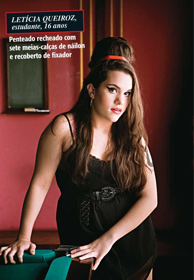 Cada vez que sai para uma festa, a estudante Letícia Queiroz, de 16 anos, moradora da Tijuca, se dedica a um complicado ritual em frente ao espelho. Ela enrola sete meias-calças para formar uma bola e fixa o arranjo no topo da cabeça. Penteia os longos cabelos castanhos por cima da pelota de náilon para escondê-la por completo. Para manter a estrutura no lugar, aplica uma pesada camada de laquê por cima de tudo. O arremate é dado com uma fita que realça o coque, numa adaptação de um penteado típico dos anos 60, chamado de beehive (colmeia) ? na internet, há videos que mostram outras variações com esponjas de aço ou latinhas de cerveja como recheio. Arrumado o cabelo, completam o look batom vermelho, delineador nas pálpebras e um adesivo sobre o lábio, imitando um piercing. No braço, Letícia desenha uma ferradura e escreve as palavras Daddy?s Girl (garota do papai, em inglês). Depois que tudo fica pronto, ela economiza nos movimentos, pois um gesto brusco pode colocar abaixo toda a complexa produção. “Dá trabalho, mas vale a pena. Outro dia fui a uma festa de debutante e arrasei”, conta Letícia. Com seu excêntrico visual, ela procura mimetizar Amy Winehouse, diva britânica do pop e da soul music, que desembarcou no Brasil na quarta-feira (5) para uma série de cinco shows, dois deles no Rio de Janeiro, na segunda (10) e na terça-feira (11). Fanática pela cantora, a adolescente está exultante. “Ela é simplesmente o máximo”, resume.
