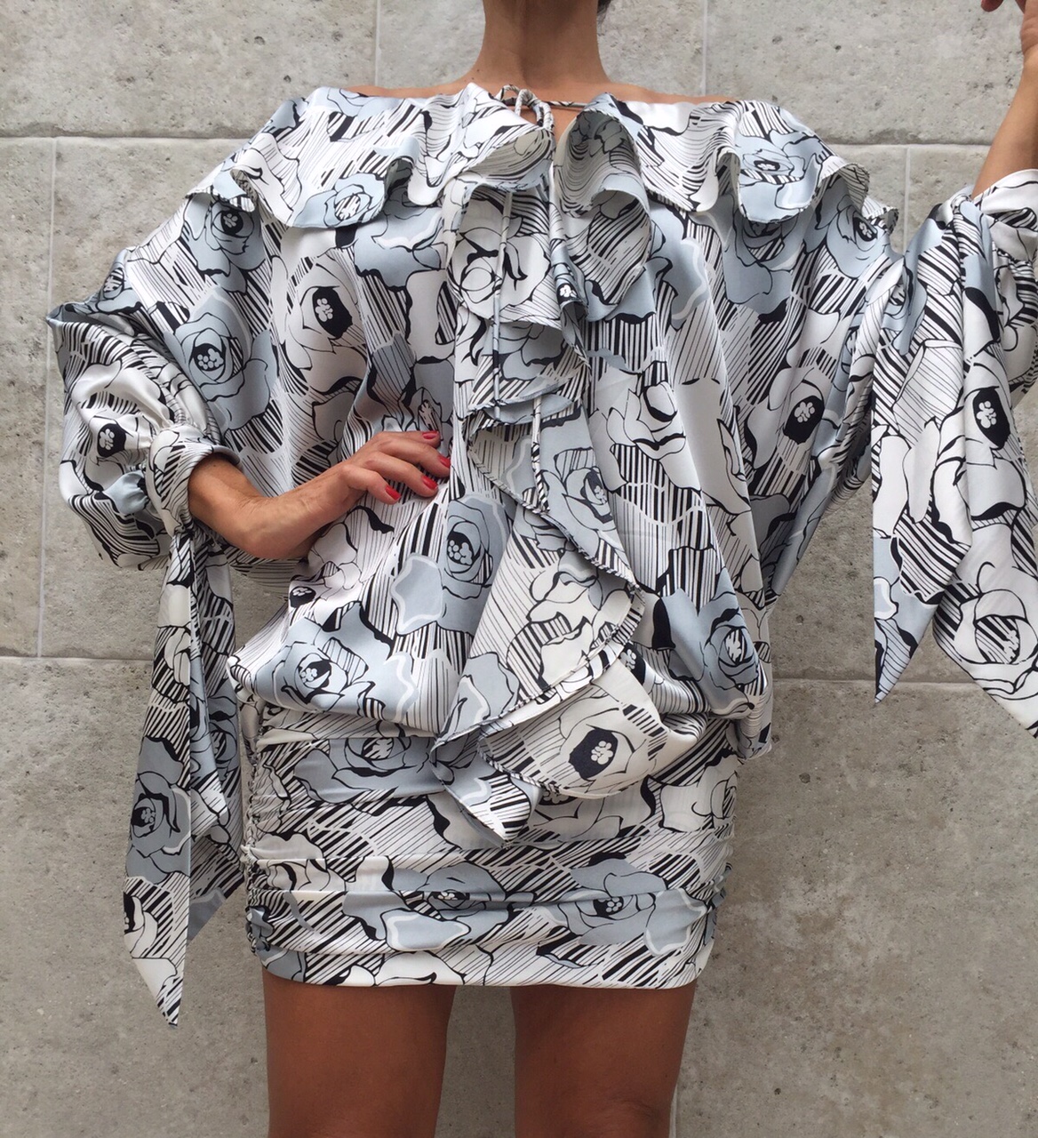 Vestido prêt-à-porter de cetim, estampado, com pala drapeada no quadril.