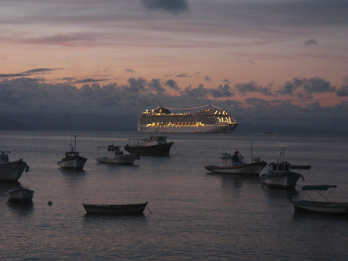 O transatlântico passa ao largo, contrastando com a silhueta dos barquinhos dos pescadores.