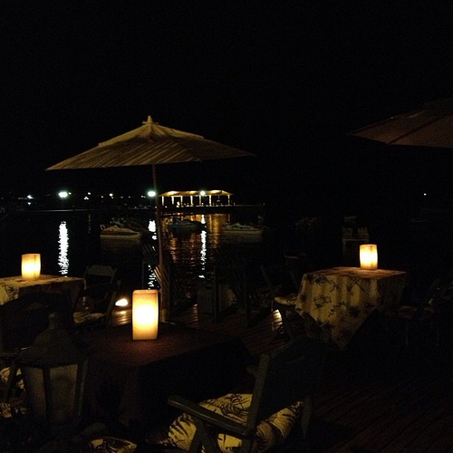 À esquerda do pier, a luz do sol, que já se pôs, ainda ilumina a paisagem.