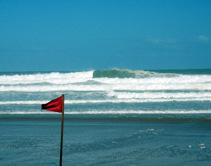 Ondas constantes, das frontais no centro às direitas e esquerdas ao longo do arco da praia, convidam para a prática do surfe, do wakeboard e do bodyboard. A bandeira vermelha indica que há correntes fortes puxando para fora, mas nada que faça os esportistas desistirem, quando o swell convida a molhar os pés (Foto: Heloisa Barros).