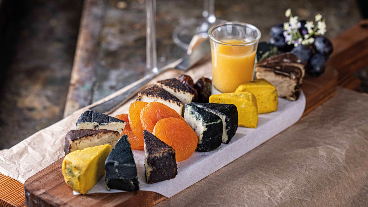 São feitos na casa os queijos veganos do Esperança Eco (Rua General Glicério, 224-D, Laranjeiras), nos sabores trufado com carvão vegetal, defumado com açafrão, fermentado com espirulina, e com cacau (R$ 119,00, com frutas, nuts e pães). @esperancaeco
