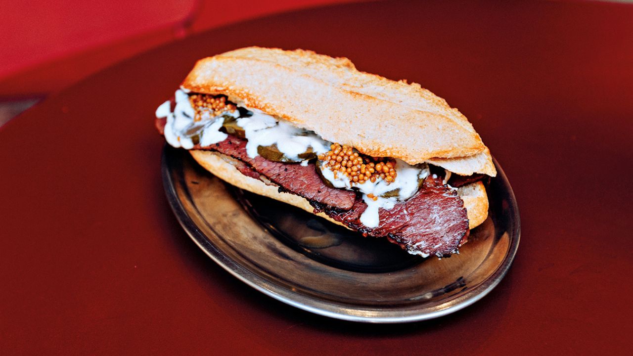 Especialidade da gostosa Nizza Rotisseria (Rua General Glicério, 15, Laranjeiras), a salumeria brilha na vitrine e em lanches como o pastrami (R$ 42,00) no pão italiano, feito na chapa. No recheio, carne angus, molho tahine, picles de pepino e mostarda de Dijon. Vale pedir um dos vinhos naturais em taça (a partir de R$ 24,00 ) @nizzarotisseria.