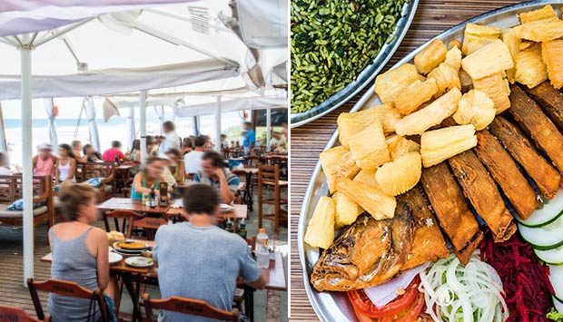 Sobre as areias da Praia da Reserva, um quiosque com capacidade para até 200 pessoas oferece um variado cardápio de pescados