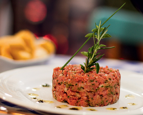 Prato principal: quenelle de salmão ao molho de limão verde com legumes ou steak tartare com fritas.
