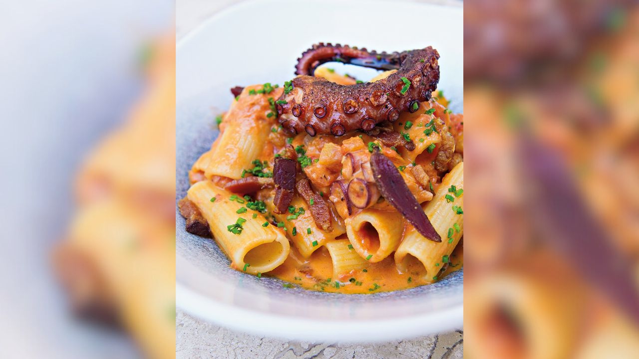 A cozinha exalta a tradição com toques próprios, oferecendo de entrada o salmão gravlax (R$ 89,00), com chutney de manga, melão marinado e creme de limão-siciliano, servido sobre folha de arroz crocante. O polvo tostado (R$ 89,00) é grelhado na brasa com aioli, batata calabresa crocante e cogumelos assados; e o molusco aparece novamente no rigatoni alla vodka (R$ 99,00), junto com guanciale, no molho cremoso de tomate com um toque da bebida.
