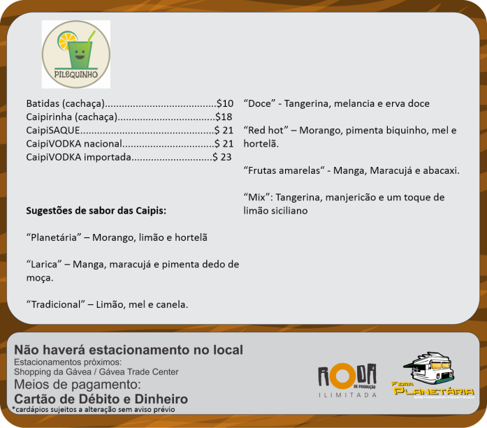 Entre os destaques da vez, estão o Al Taglio, com pizzas cortadas na tesoura, o Graviola Truck, conhecido pela comida saudável, o Pilequinho Caipitruck, com criações de drinks originais, e o Los Mendozitos que irá lançar uma nova bicicleta na feira. O Sushi Barcelos e o Delfina, famoso pelos cardápios inspirados na carne de pato, e a batata frita com molhos exóticos do Frites também estarão presentes, assim como o chef Fred de Maeyer, apresentando pratos contemporâneos. Confira detalhes do cardápio na galeria acima.