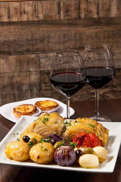 – Bacalhau à lagareira (bacalhau assado no azeite extra virgem, batatas ao murro, cebolas, tomate e azeitonas) + sobremesa (dois pastéis de nata) + duas taças do vinho tinto português Paulo Laureano (R$ 139,00)