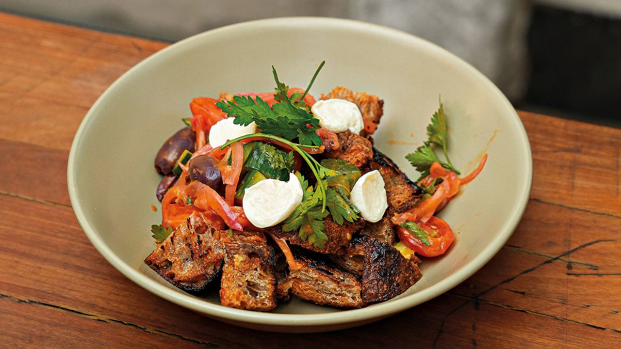 Sourdough, legumes, mussarela, azeitonas, aliche e molho de alcaparras compõem a panzanella (R$ 45,00), opção da The Slow Bakery (Rua Maria Angélica, 113, loja G, Jardim Botânico). Outra pedida são os salpicões de frango ou porco (R$ 49,00), com vegetais grelhados, limonese da casa e crocante de pão. @theslowbakery.