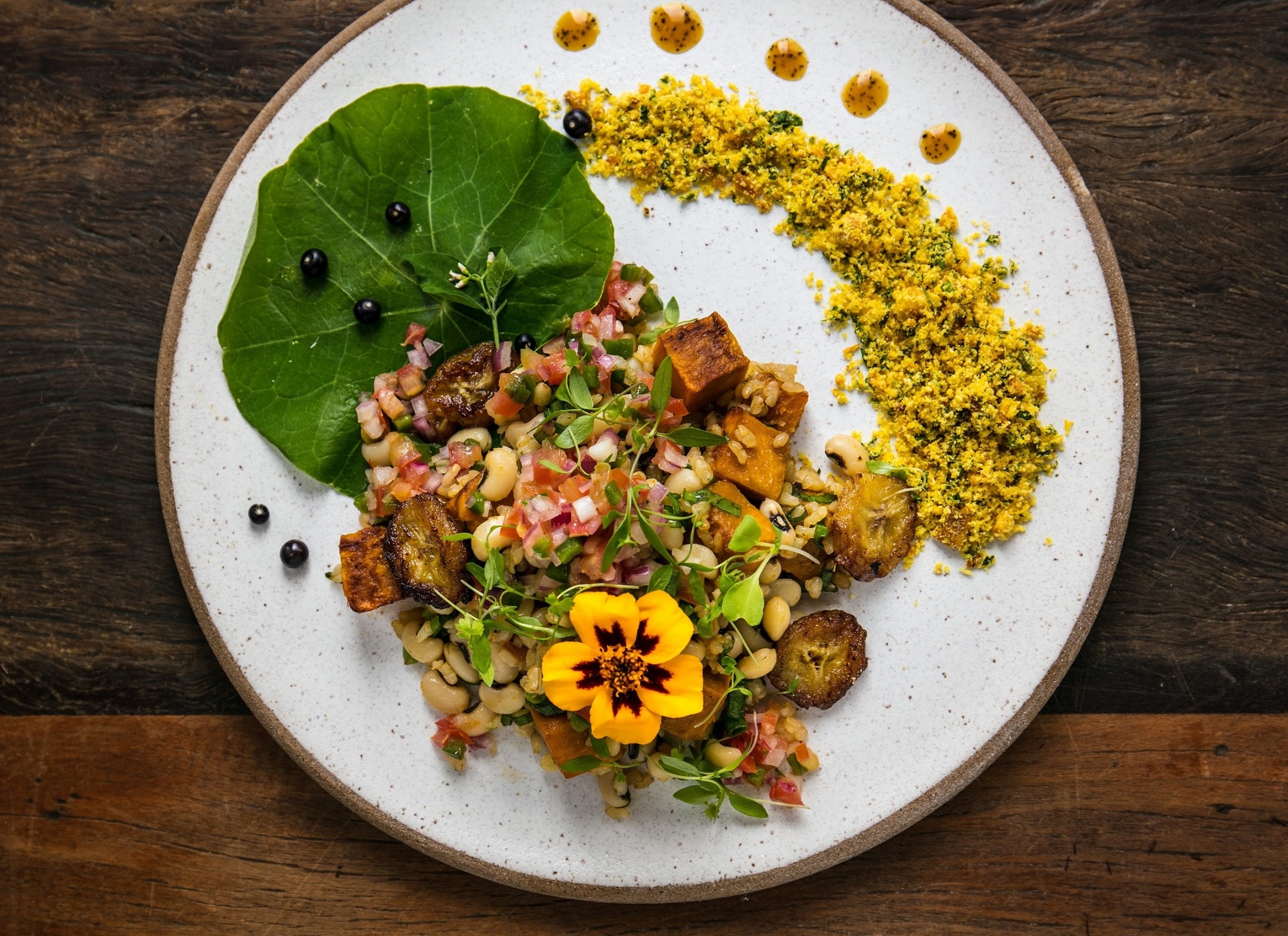 Tati Lund elabora receita inspirada no Norte (foto): arroz integral com feijão-manteiguinha-de-santarém, abóbora, jambu e banana mais farofa de cúrcuma e molho de maracujá (R$ 61,00).