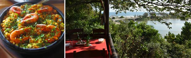 O visual é arrebatador na varanda cercada pela Mata Atlântica, com os manguezais e a Restinga de Marambaia ao fundo, e a comida caiçara segue as receitas tradicionais dos pescadores da região. Quem comanda o restaurante é Ubiratan de Souza Leal, o Bira, ex-pescador e salva-vidas, filho de Tia Palmira, cozinheira famosa na área, e pintor dos quadros praianos que enfeitam as paredes. O negócio é relaxar com as cervejas e caipirinhas da carta de bebidas e começar o almoço com o vinagrete de frutos do mar, feito com camarão, polvo e marisco. O filé de robalo com arroz de frutos do mar brilha como prato principal, em que o peixe é cozido com limão sobre cebolas em rodelas, e servido com farofa de dendê. O prato é servido com fartura para três.