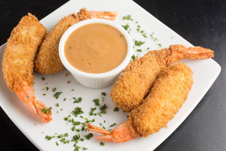 Entrada: Camarão praiano (seis camarões VG recheados de catupiry, empanados com farinha panko e acompanhados de molho de frutos do mar picante; R$ 39,90)