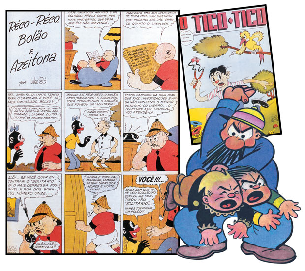 Em meio aos desenhos em exibição, há exemplares capazes de atrair a fúria das patrulhas politicamente corretas que recentemente se insurgiram contra Monteiro Lobato e imaginários conflitos de classe e raça em O Sítio do Pica Pau Amarelo. No clássico Chiquinho, criado por Luís Gomes Loureiro em 1915, o pequeno herói que remete ao americano Buster Brown tem como comparsa nas traquinagens Benjamim, um garoto negro inspirado em um dos empregados da casa do autor e responsável pelas piores barbaridades, quase sempre coroadas com surras de escova desferidas pelos adultos ao fim de cada epopeia. Há tramas em que o nome dos personagens, de cara, já provocaria protestos em militantes mais empedernidos. Em uma das séries populares das décadas de 30 e 40, de autoria de Luiz Sá, três gaiatos viviam de pregar peças uns nos outros. Um deles, negro, de traços caricatos, recebia o nome de Azeitona (uma denominação entre jocosa e pejorativa, usada na época no Ceará, o estado natal do autor). O outro, gordo (ou obeso, para não ofender os mais suscetíveis a potenciais ofensas), chamava-se Bolão. A trinca era completada por Réco-Réco, um sujeito permanentemente atormentado por seus cabelos arrepiados. Nas historietas, o fumo era liberado, podia-se tomar um trago aqui ou ali e a molecada costumava atacar passarinhos com estilingue. “Essas situações precisam sempre ser compreendidas dentro de um contexto de época”, explica Álvaro de Moya, estudioso do assunto e autor dos livros Shazam! e História da História em Quadrinhos. “Era comum certa maldade dos personagens, como também punições exageradas, já que os quadrinhos tinham um papel pedagógico, com toques de humor. Qualquer tentativa de enxergar nisso traços de discriminação racial ou apologia à violência e a desvios de conduta é pura bobagem.”