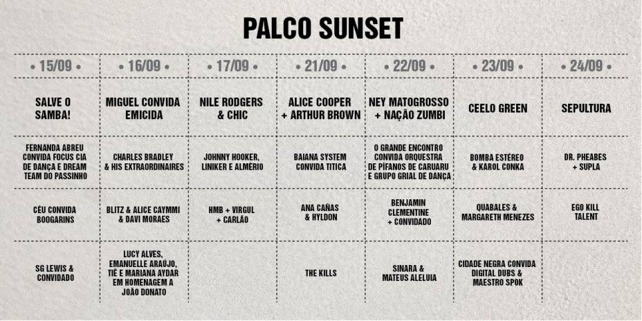 Há seis anos sem vir ao Brasil (o último show no Rio foi em 2011, no Circo Voador), a americana Alison Mosshart e o inglês Jamie Hince (ex-marido da modelo Kate Moss) tocam no dia 21 de setembro, quando o Aerosmith fecha a noite no palco principal, e prometem um receber convidado surpresa. No mesmo dia, apresentam-se ainda no Sunset o Baiana System com a cantora angola Titica, Ana Cañas e Hyldon, além de Alice Cooper e Arthur Brown. Em turnê pela Europa, estados Unidos em Canadá para com o disco Ash & Ice, lançado no ano passado, o Kills fará dois shows abrindo para o Guns N’ Roses em Londres.