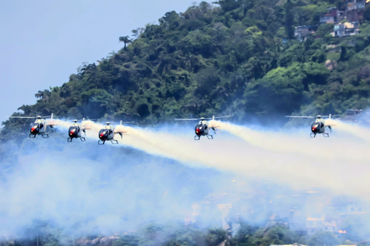 Cinco helicópteros espanhóis da Patrulla Aspa, esquadrilha de demonstração aérea da Força Aérea Espanhola, em ensaio